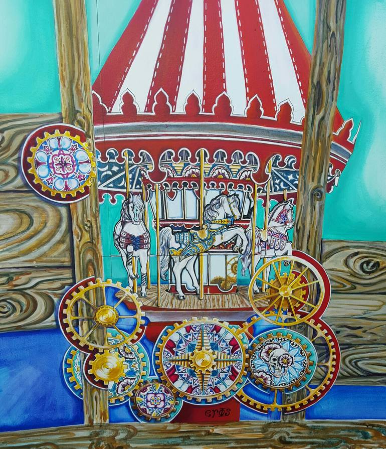 Peer through the broken pieces of an old fence to see the Clockwork Carousel. Is it an old poster, peeling away? Or is it a gateway. That is up to you.