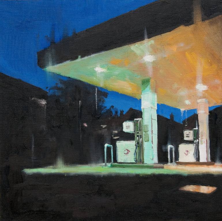 This painting won The Gordon Hulson Memorial Prize for Draughtsmanship, Variety & Exploration at the RBA 2014 I was super struck by the balance of the artificial light of the petrol station and the evening dusk. The shelves of the station mini market were bare and the attendant was clearing up. I w...