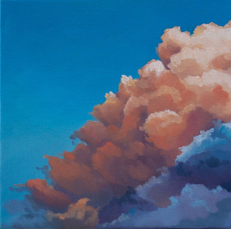 Cloud Burst, oil on canvas, 8 x 8 inches, 2024, ready to hang, painting wraps around edges so framing is optional, signed on back. Nature bath in the peaceful but mighty clouds caught in a sunset.