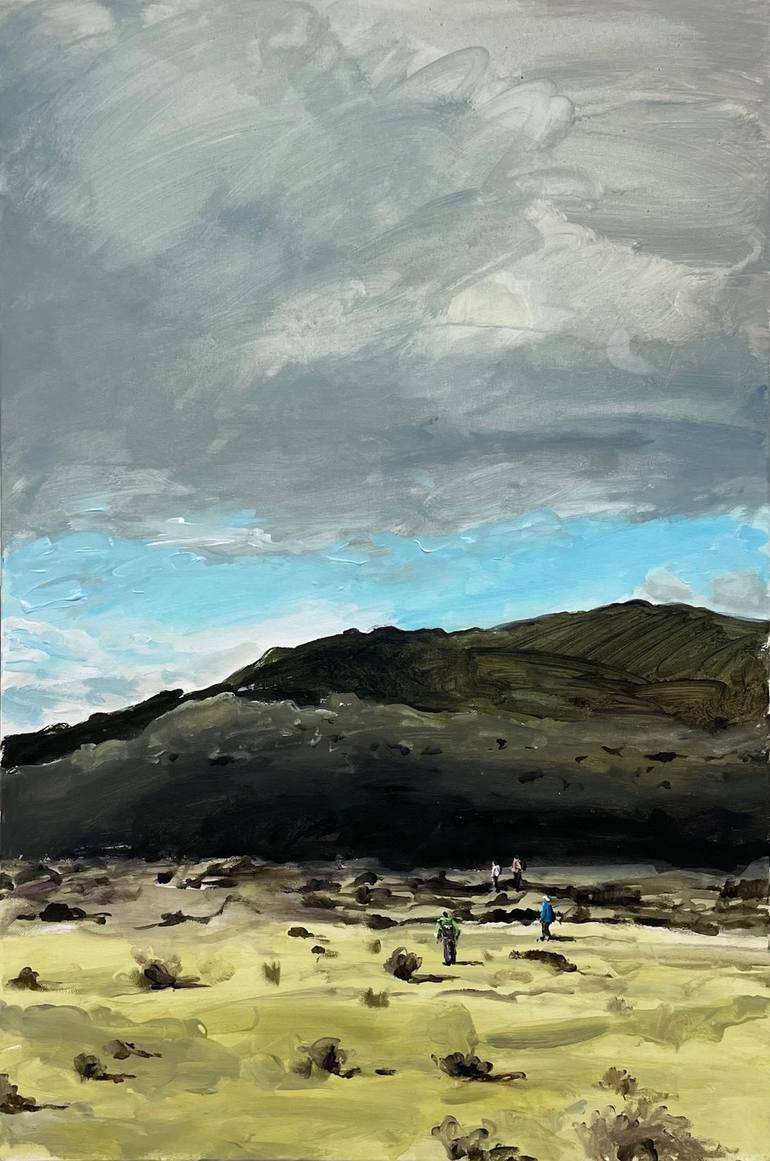In this painting titled 'Cloud over' I tried to paint and convey the atmosphere of rainy weather. The duller colours are in contrast with yellow and blue. The big grey cloud overhangs the hill but the blue sky in the background creates strong perspective and brings visitors deeply into the painting....