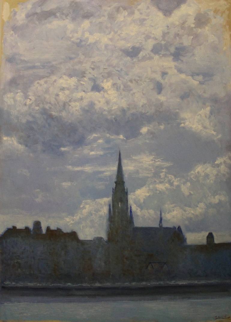 Oil painting of clouds over Osijek and the Co-cathedral.