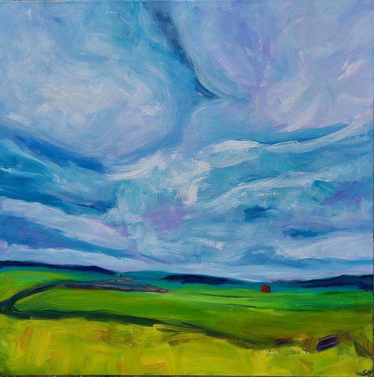 This painting of a cloudy sky is painted in oil on a 30 x 30 inch canvas. The subtle blend of greys and blues create a peaceful atmosphere and a feeling of an overcast day. The painting includes a hint of land in the distance, adding a sense of depth and perspective. This artwork would be an ideal a...