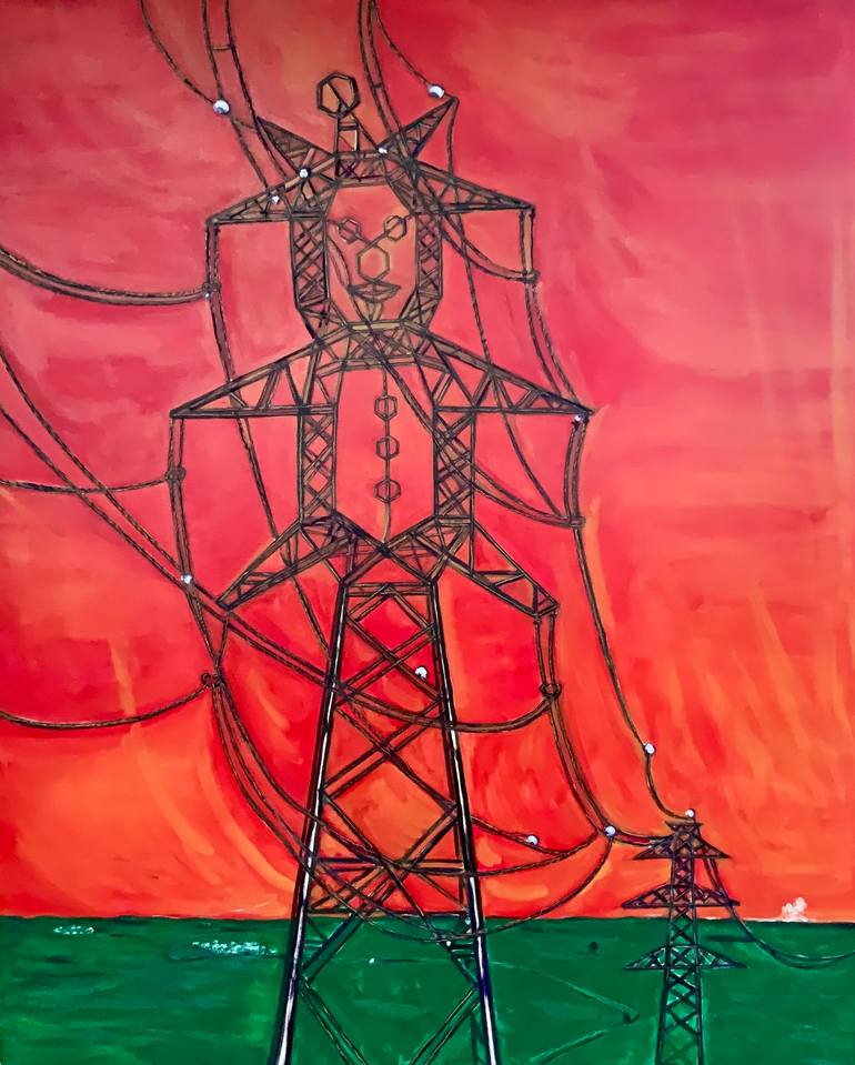 This artwork, part of my series on power line towers, symbolizes the entrapment of individuals in modern, industrialized society. The tower, depicted with clown-like and puppet-like features, represents people bound and controlled by societal and industrial constraints. The stark contrast between th...