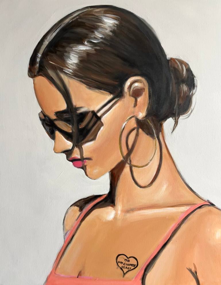 Maria Folger is a photorealist painter who lives in Los Angeles. She uses acrylic and oil paint to create portraits of women, playing on sexuality and femininity. Maria often depicts lingerie-clad beauties, vampy red lips, and patent heels but juxtaposes these subjects with pizza slices and pineapples, adding a humorous tone to some of her sensual works.