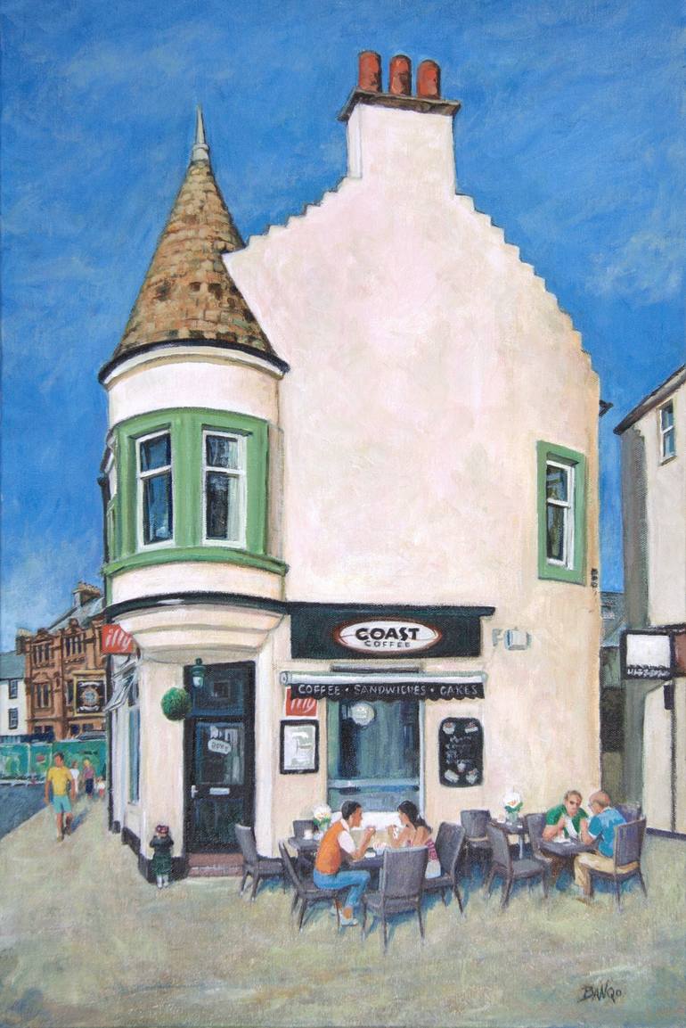 On a hot sunny summers day I visited Anstruther, a fishing town in Fife. On the main street, by the harbour, I saw a picturesque building, with an apartment over the Coast Café, I knew I had to paint it! I included the blue green screens where the street was being repaired because they complimented ...