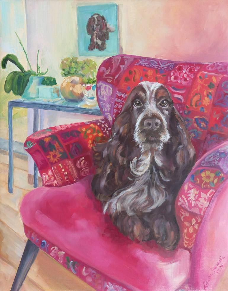 Meet Dante, my adorable dog. He is a unique and absolutely noble character. I love painting him at any time of the day. In this artwork I painted him while sitting in a red armchair. I pointed out the details of the armchair and the interiors, resulting the painting more decorative and narrative Ori...