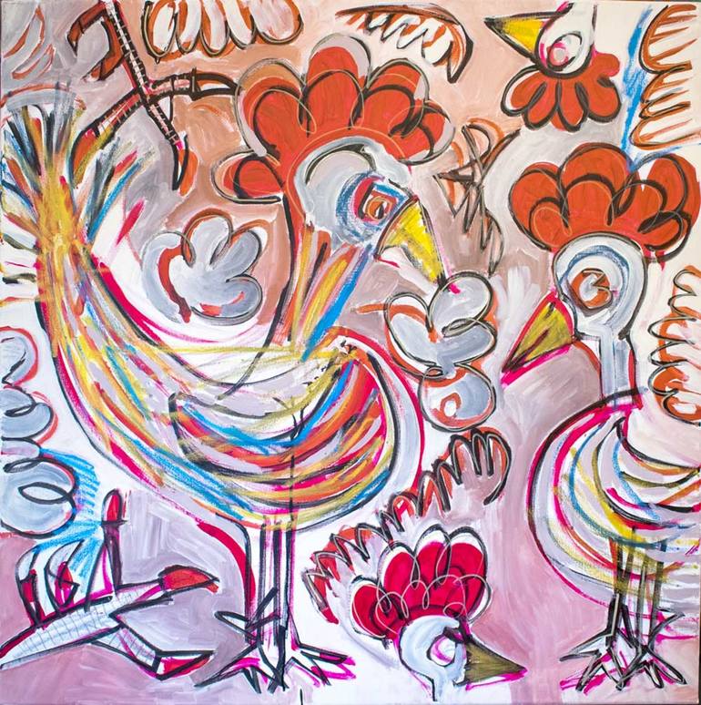 cockfight its very popular in Mexico where i lived for 17 years. The painting expresses the clorfull experience of a cock figting...