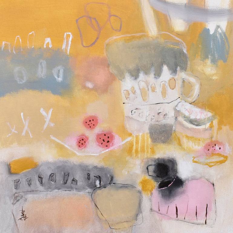 Title: Coffee Indulgence Size: 59.8 x 59 cm Painting: Acrylic on Canvas Year Created: 2022 *The image you see here is the whole canvas, and so it is like a full-bleed photograph/poster. For this type of work, the painting can be mounted on a board to make a floating frame or a passe-partout frame b...