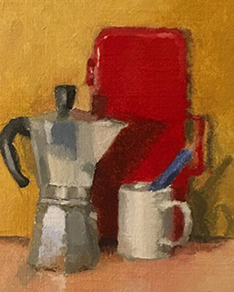 This little alla prima painting was spontaneous, the result of a late night urge to paint a minuscule still life in my equally minuscule Greenpoint studio with only a few objects to pose. The painting is about reliability: a no-fuss metal coffee pot, a tough little pencil box, and a well-used mug ar...