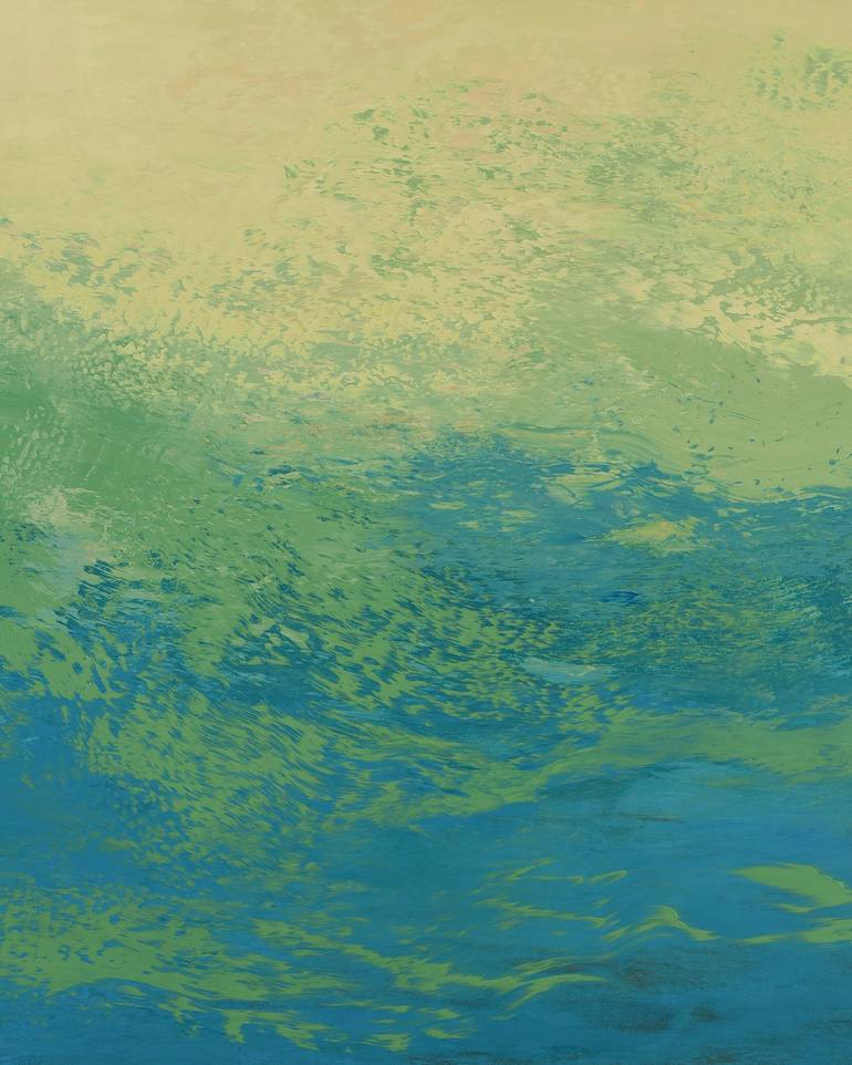 Color Flow is an original abstract expressionist style painting by Suzanne Vaughan in soft yellow, green and turquoise blues. Thick paint is applied to the canvas in free gestural marks with palette knives and other tools to create a dynamic textured surface. With multiple applications each layer in...
