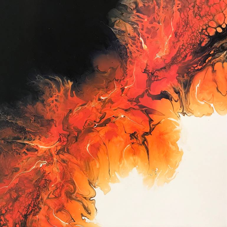 Abstract Hand Painted Acrylic Pour Painting "Color Fusion No. 17" in orange, white and black ideal for home and office. - Title: "Color Fusion No. 17" - Size: 12" H x 12" W - Hand signed by artist on bottom edge - 1½” thick gallery wood frame - Seamless color blending over four sid...