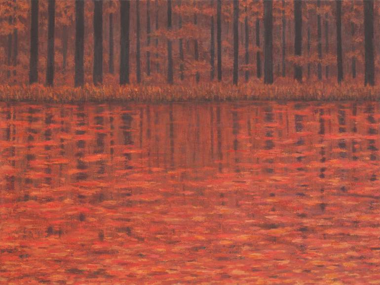 Inspired by the colors of autumn. A pond in the forest with colorful autumn leaves.