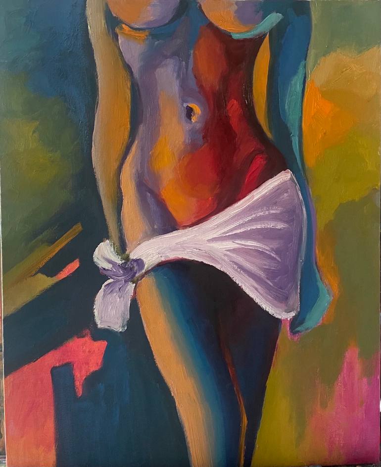 Figures have organic shapes and I like to paint organic shapes with geometric and abstract background to create a balance for the painting.