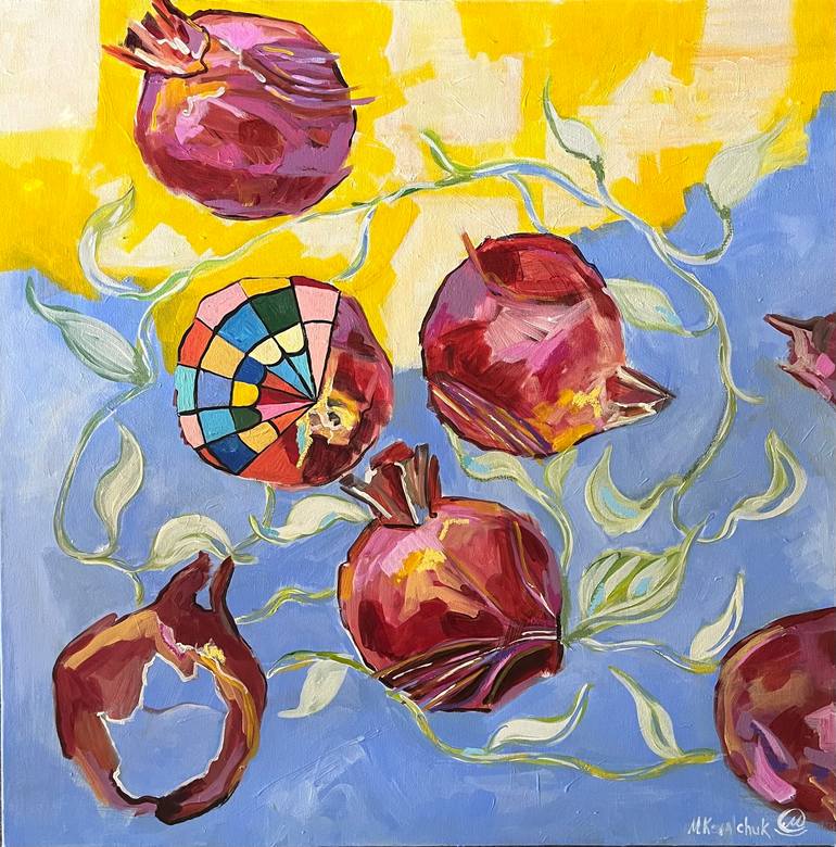Color of pomegranate. 2025 Acrylic and pastel on canvas. Ready to hang. The pomegranate as a symbol carries deep meaning, associated with life, fertility, renewal, and spiritual unity. This image resonates particularly strongly in the context of Ukrainian culture, as the symbolism of fruits has oft...