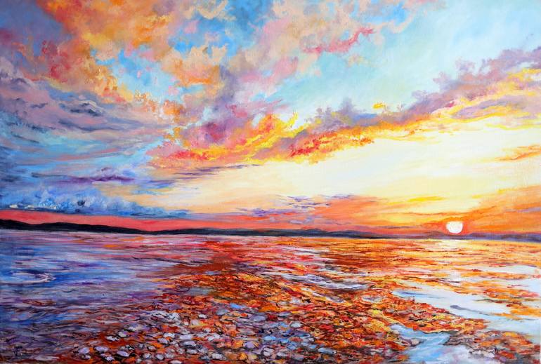 Technique: Oil on Canvas Ready to be hung. Framing on request. Dimensions: 80 by 60 cm With the sunset as my muse and oils as my brush, I captured the vibrant fire of a sky exploding in warm colors and water gently reflecting every luminous hue. This painting, a dance between realism and expression...