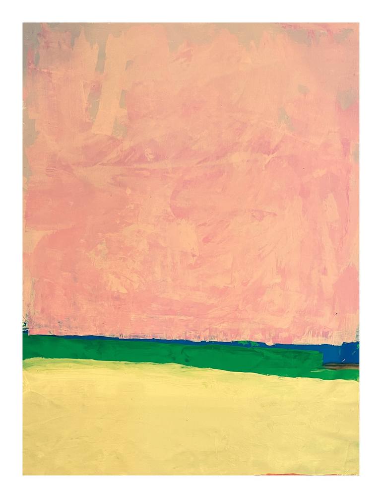 TITLE: Colorfield 23 Here's an oversized painting on canvas. It's a minimalist landscape in pink and yellow with green and teal elements. Will ship in a tube to be stretched by your local framer. I would suggest having it framed in a white floater frame as it would really finish the piece off nic...