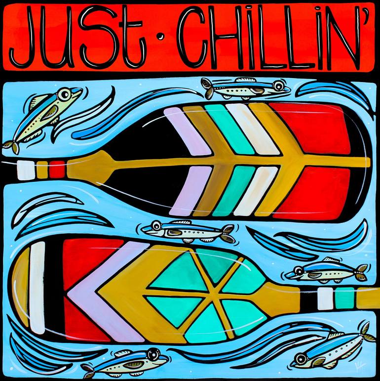 Vibrant and stylized artwork featuring colorful paddles alongside fish and swirling waves, accompanied by the phrase "Just Chillin'". Ideal for themes related to leisure and creativity.