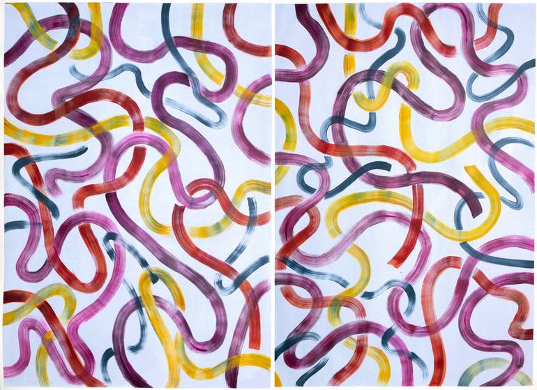 "Colorful Abstract Forms on Vanilla" is an abstract painting diptych by Spanish artist Natalia Roman. It is a beautiful series of rhythmic brushstrokes combined with subtle tones and unique shapes that is both classy and fresh. Natalia Roman was born in 1984 in Girona, Spain. She has exhibited in g...