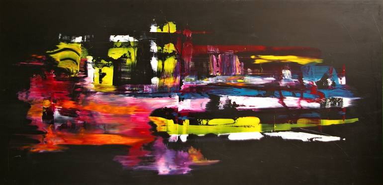 Importance of creating work that is infused with energy and spirit about 'squeegee' abstractions and colorful painting. This picture is one of a serie of only abstract paintings started out as large colorful almost super-realist paintings with expressiv shapes appearing to fly out towards the viewer...