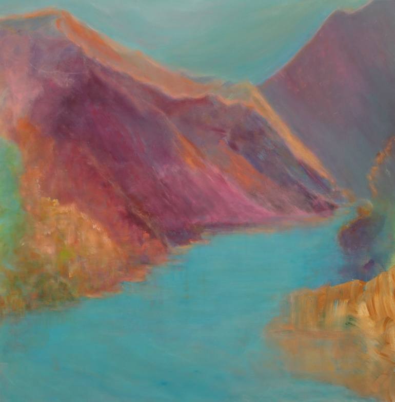 We can admire colorful mountains in many places around the world. Maybe these violet-ochre-pink mountains I painted exist somewhere. It's my fantasy escape., Medium: Acrylic on canvas., Size: 70x70 cm / 28x28 in.