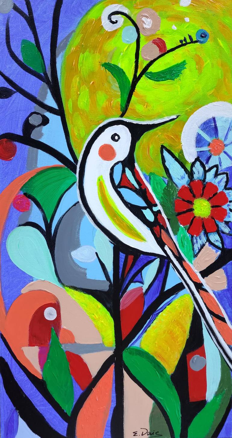 What or who inspired the work? The artwork is inspired by the harmony and vibrancy of nature, particularly through the depiction of a bird surrounded by colorful abstract shapes that resemble flowers, leaves, and natural elements. This scene suggests an appreciation for biodiversity and the interc...