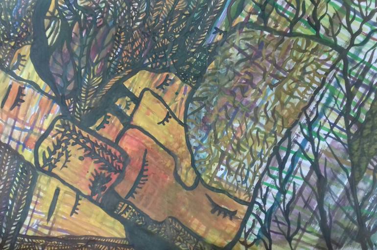 Coloured autumn storms Depicted in faces , masks, colours, trees, and fall leaves.