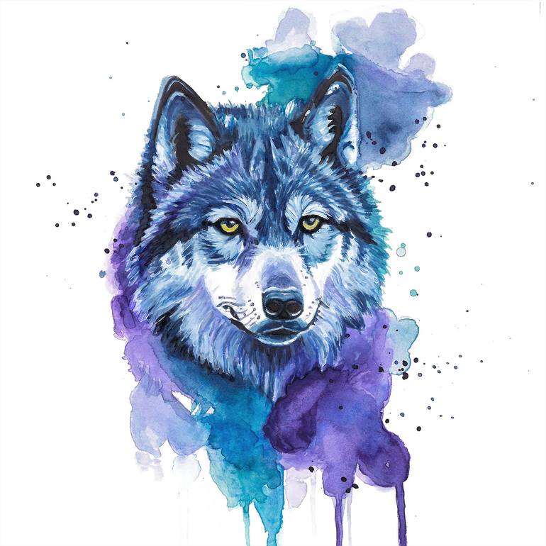 Colourful Wolf watercolour drawing, which is part of a collection of twenty spirit animals with the colours purple, blue and turquoise, painted with Japanese watercolours. It took me three months to complete all the animals, painting hours on end in a small finca in the middle of 40 hektares of oli...