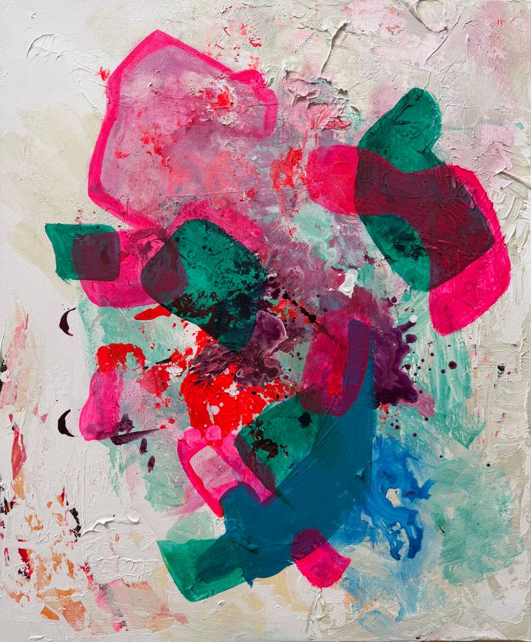 This abstract painting is a lively conversation of color, texture, and movement. Bright pinks, deep greens, and saturated blues overlap and collide, layered with expressive marks and playful splashes. Thick texture and transparent shapes create depth and rhythm, inviting the viewer to explore where ...