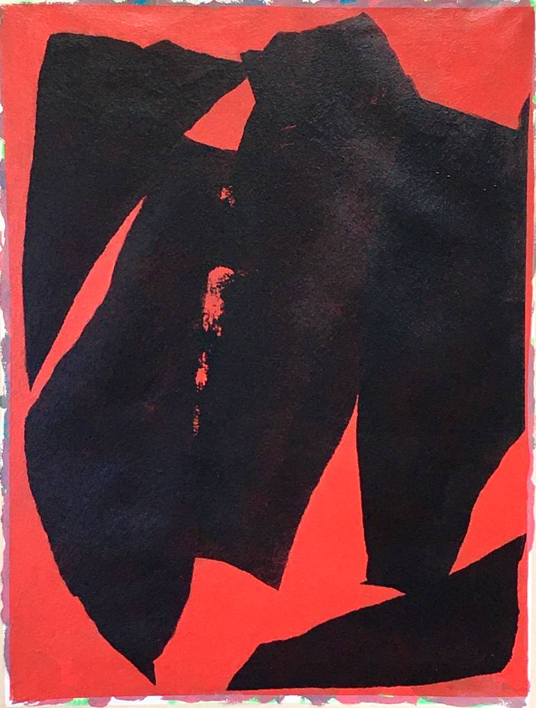 Transitional piece from collage with hard edged papers to stenciling with paint.
