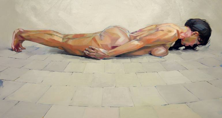 The art canvas is shipped rolled in a tube along with its wooden stretcher frame. "Complete Figure Under Tension," 80 x 150 cm. In this artwork, I present the figure in its entirety, from head to toe, while maintaining a captivating sense of tension. The unconventional pose of the figure lying face...