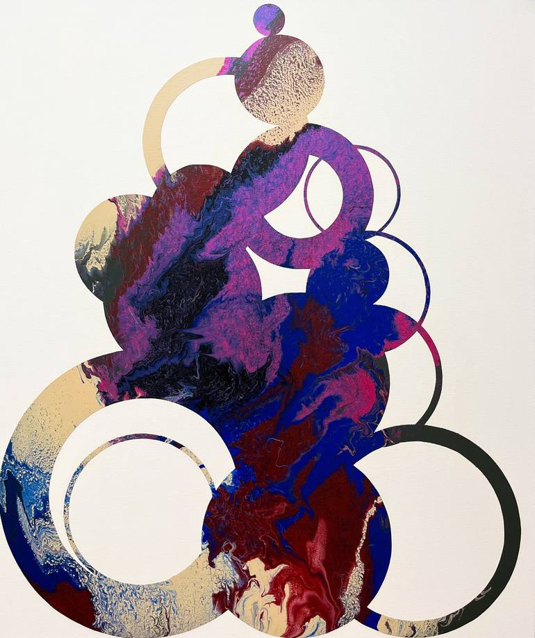 The artist was born in Nicosia, Cyprus (October 1987), where she currently lives and works. She holds a DNAP, (Diplôme National d’Arts Plastiques), from the Ecole Supérieure des Beaux-arts de Nîmes, as well as a DNAP and a DNSAP, (Diplôme National Supérieur d’Arts Plastiques), from the Ecole Nationale Supérieure des Beaux-arts de Paris, France, obtained with Distinction. Eleni Pratsi produces artworks with geometric compositions and explosive, liquescent colours. She utilises both painting and printmaking techniques, evoking a balance between creative control and affirmation of chance, which extends throughout all the works. Every composition is created from experimentation with different colour combinations and the infinite possibilities that surface through the repetition, overlap and juxtaposition of circles. The use of stencil, a meticulously cut-out original which meets the canvas, creates sometimes sealed, and other times porous boundaries for the vivid colours that are poured directly on it. The colour palette is influenced by pop culture, developments in pigments and industrial paint production, which Pratsi continually researches. The paint, whose density is specific but different every time, interacts within the in-between space of canvas and stencil in ways that are often surprising. The specifics of gravity, which carries the paint on the painterly surface, play an important part in the creation of colour drips and blocks. Having developed a special relationship to the materiality of painting and the multiplicity of printmaking, Pratsi proposes images that do not impose a fixed meaning but invite the eye to travel within otherworldly landscapes, seen as if from above. The visual and emotional connections one can make, lead to different interpretations of the works. The title of the exhibition, “La Vie en Ronde”, can be interpreted to refer to the “roundness” of life, that feeling of things being mysteriously tied to each other, turning on their own accord, flowing, mixing, and mingling on endless horizons. Evagoras Vanezis Art Theorist