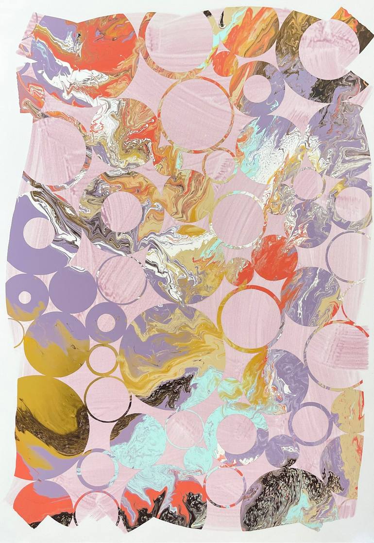The artist was born in Nicosia, Cyprus (October 1987), where she currently lives and works. She holds a DNAP, (Diplôme National d’Arts Plastiques), from the Ecole Supérieure des Beaux-arts de Nîmes, as well as a DNAP and a DNSAP, (Diplôme National Supérieur d’Arts Plastiques), from the Ecole Nationale Supérieure des Beaux-arts de Paris, France, obtained with Distinction. Eleni Pratsi produces artworks with geometric compositions and explosive, liquescent colours. She utilises both painting and printmaking techniques, evoking a balance between creative control and affirmation of chance, which extends throughout all the works. Every composition is created from experimentation with different colour combinations and the infinite possibilities that surface through the repetition, overlap and juxtaposition of circles. The use of stencil, a meticulously cut-out original which meets the canvas, creates sometimes sealed, and other times porous boundaries for the vivid colours that are poured directly on it. The colour palette is influenced by pop culture, developments in pigments and industrial paint production, which Pratsi continually researches. The paint, whose density is specific but different every time, interacts within the in-between space of canvas and stencil in ways that are often surprising. The specifics of gravity, which carries the paint on the painterly surface, play an important part in the creation of colour drips and blocks. Having developed a special relationship to the materiality of painting and the multiplicity of printmaking, Pratsi proposes images that do not impose a fixed meaning but invite the eye to travel within otherworldly landscapes, seen as if from above. The visual and emotional connections one can make, lead to different interpretations of the works. The title of the exhibition, “La Vie en Ronde”, can be interpreted to refer to the “roundness” of life, that feeling of things being mysteriously tied to each other, turning on their own accord, flowing, mixing, and mingling on endless horizons. Evagoras Vanezis Art Theorist