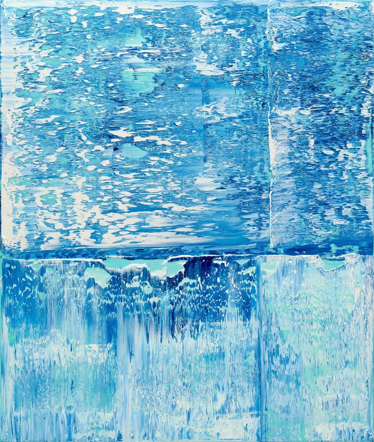 Medium size abstract painting in blue and white colors with rich texture, oil on canvas. This artwork was inspired by the paintings of Gerhard Richter and his specific style. This painting is from a series of small abstract artworks. The sense of my paintings is to be the bright color accent in the ...