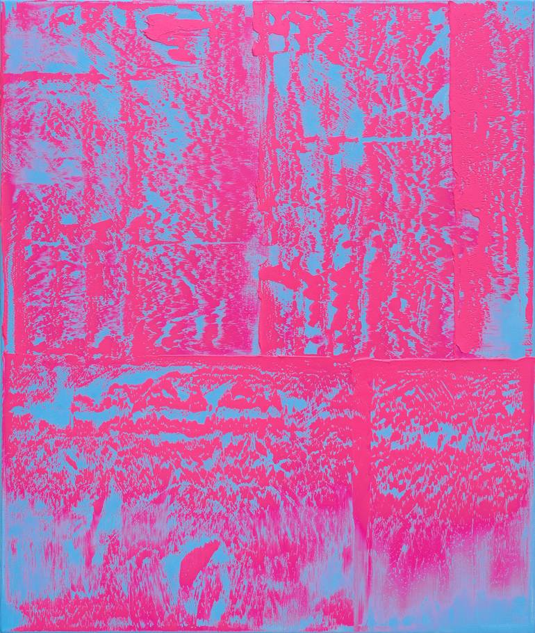 This medium-sized abstract oil painting, characterized by its rich texture and vibrant hot pink and blue hues, draws inspiration from the dynamic style of Gerhard Richter. The piece seamlessly blends colors, creating an engaging visual experience. Part of a series of smaller abstract works, it is de...