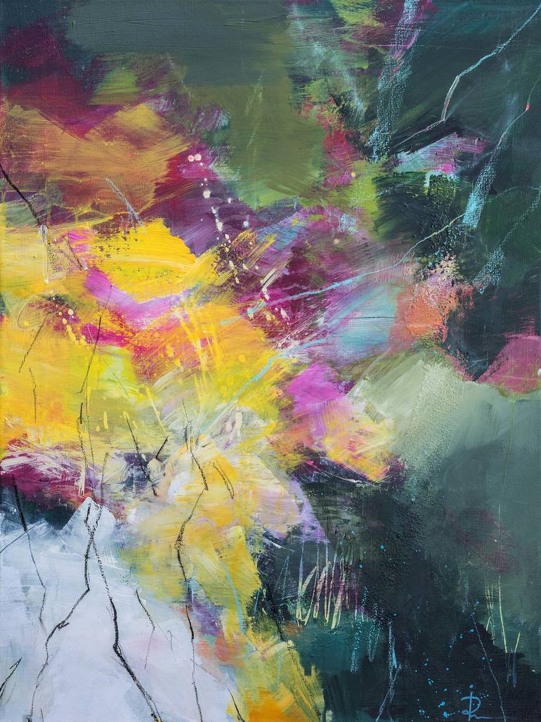 Materials: Stretched canvas, Acrylic and Oil Pastel Sides: Painted as a continuation of the motif Frame: Unframed, further framing possible but not necessary. Varnish: Silky finish with UV protection Signature: Front and verso, also signed Certificate of Authenticity The work will be shipped stretch...