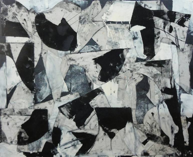 Gestural abstraction with collage elements on stretched canvas.. Ships in a crate ready to hang with hardware included.