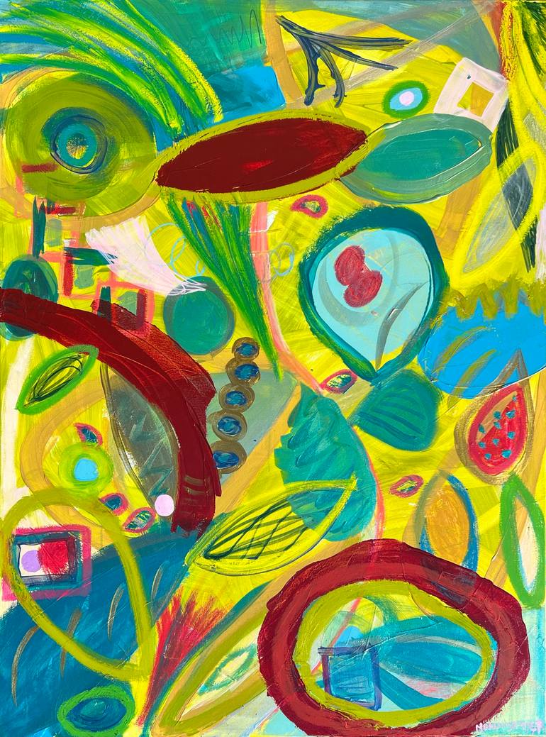 This large multimedia painting is in a new series I'm working on with a lot of color and symbolism. This piece is about the lightness of being that comes with getting your deepest darkest secrets out into the open.