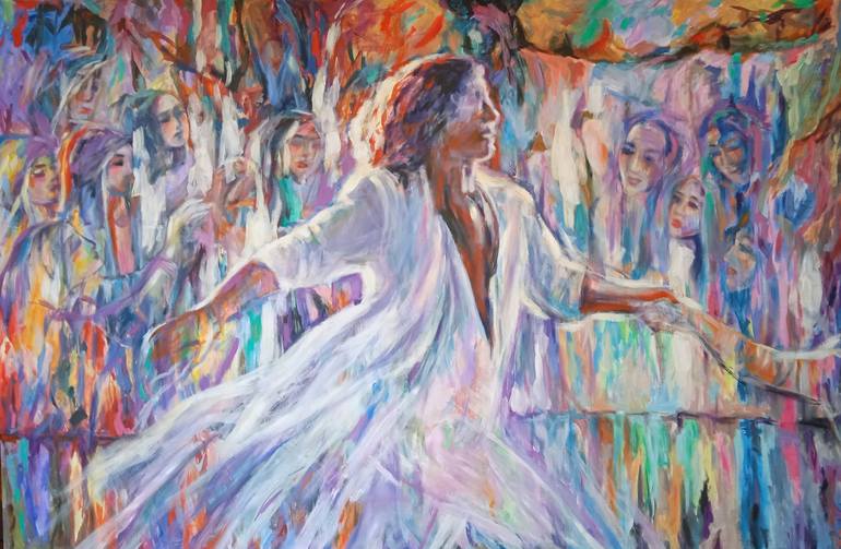 A Being of Light is going through the crowd of people ..maybe he is not even a Human, but an Idea of Love, Relations, Tenderness, Care, Friendship, Connection...Light of Heart... They are waiting for this Light...But as it is usually, they cannot see his face...People never can see a Face of Eterna...
