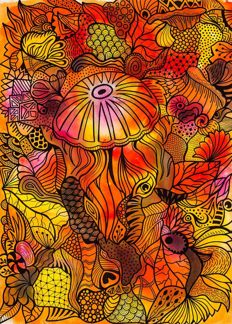 Tous les tableaux de cette série intitulée "métamorphose" débute par des taches à l'encre aquarelle qui laissent apparaître progressivement des formes que je contour et rempli de motifs dans le thème du tableau et de sa couleur principale. Ici le rouge, le jaune, le orange et la forme des tache m'on...