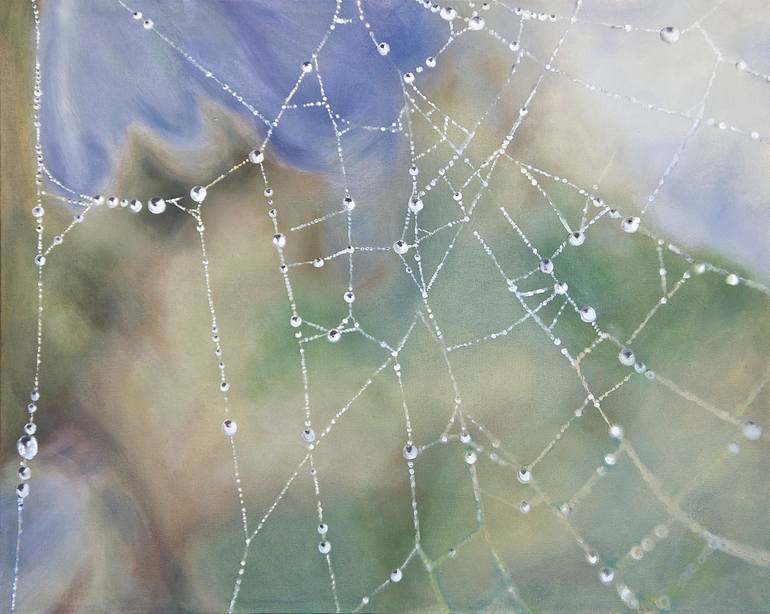 Set off by purple streptocarpus blooms in a hanging pot, a spider's nightly architecture shows off its dew drop jewels before the sun makes them a mere memory. If Greeks could see gods and heroes in the stars, surely there are pictures in these suspended dew drops? I see an elongated cat with whiske...