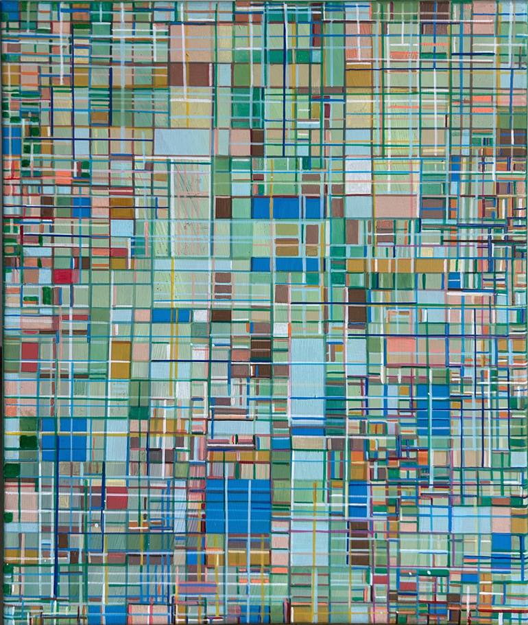 This contemporary geometric abstract painting explores structure and rhythm through a dense grid of intersecting lines and layered color fields. Created in acrylic on canvas, the composition features green, blue, beige, and earth tones, evoking urban architecture and modern systems. The balance betw...