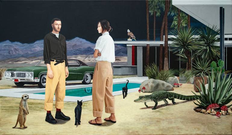 The painting conveys the idea that what we perceive as life may be an illusion, while the true reality remains hidden. At the center of the scene, a man and a woman stand by a pool, deep in thought, surrounded by animals—a meerkat, a black cat, and an alligator—that add a surreal and unpredictable q...