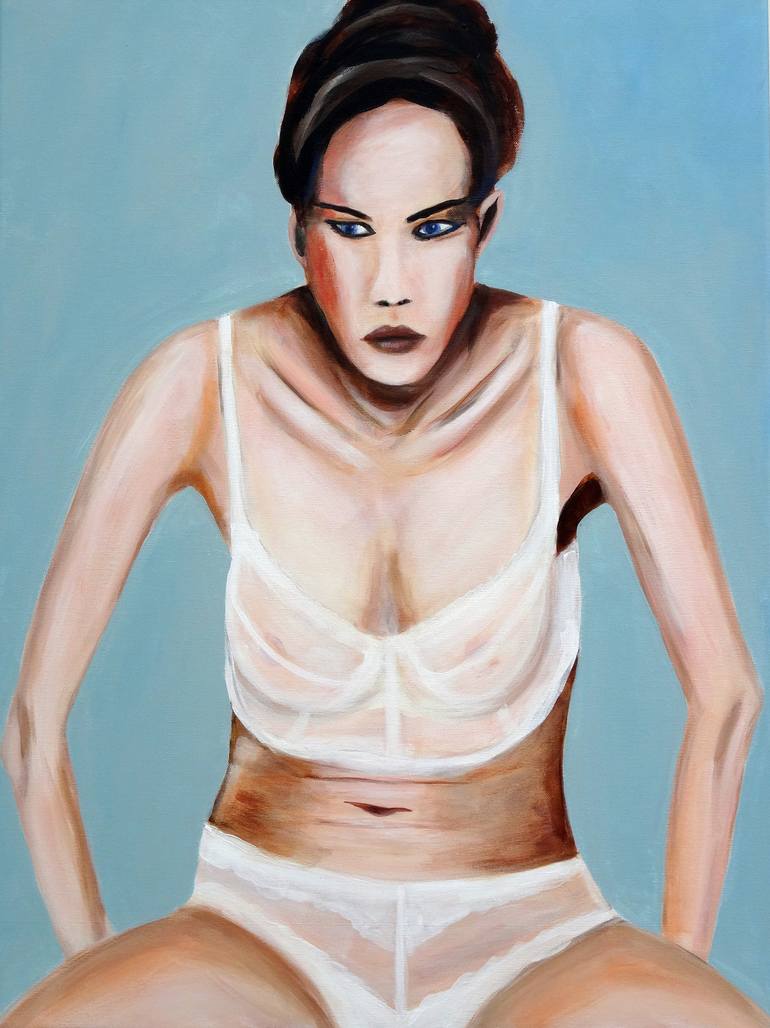 I was inspire by a photo of this woman. On canvas i have characterise her in a figurative en expressionisme style. White her eyes and looks she fills te room.