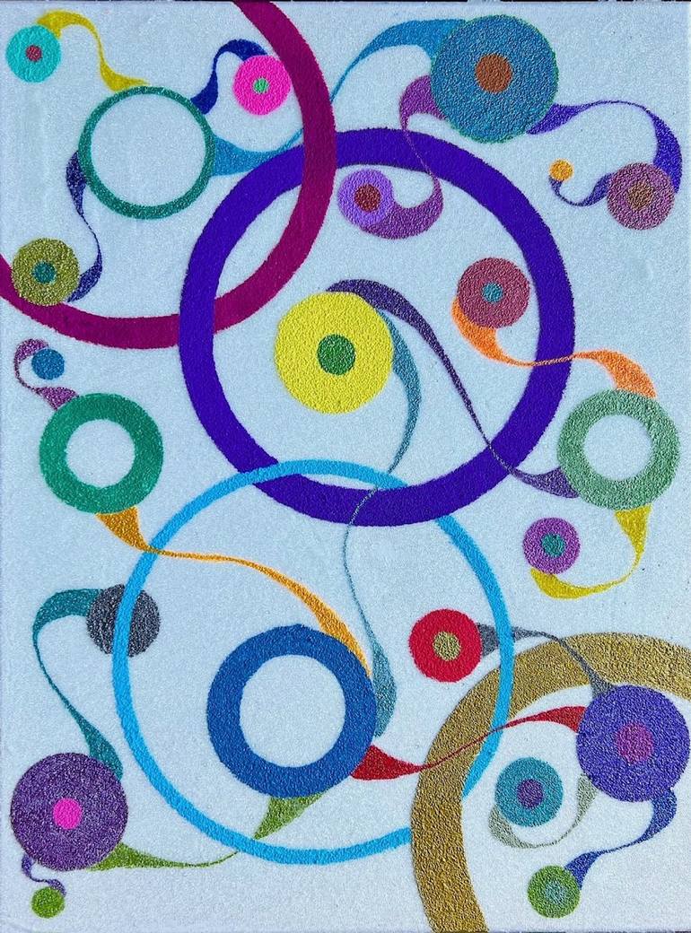 This lyrical abstract geometric painting is inspired by my love of science fiction, futurism, physics, and astronomy. This is an imaginative future star map of a as yet undiscovered system with all of its many bodies and dependencies. This piece is a divergence from my normal practice. The interlin...