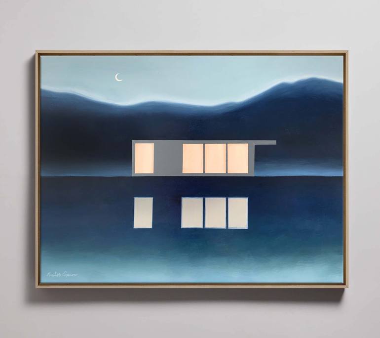 This piece was inspired by a cherished family property. I fell in love with the warm glowing light from the windows reflecting on the water and starry sky above. My modern landscape paintings reimagine the natural world in a conceptual way. These landscapes reduce and abstract organic objects to ...