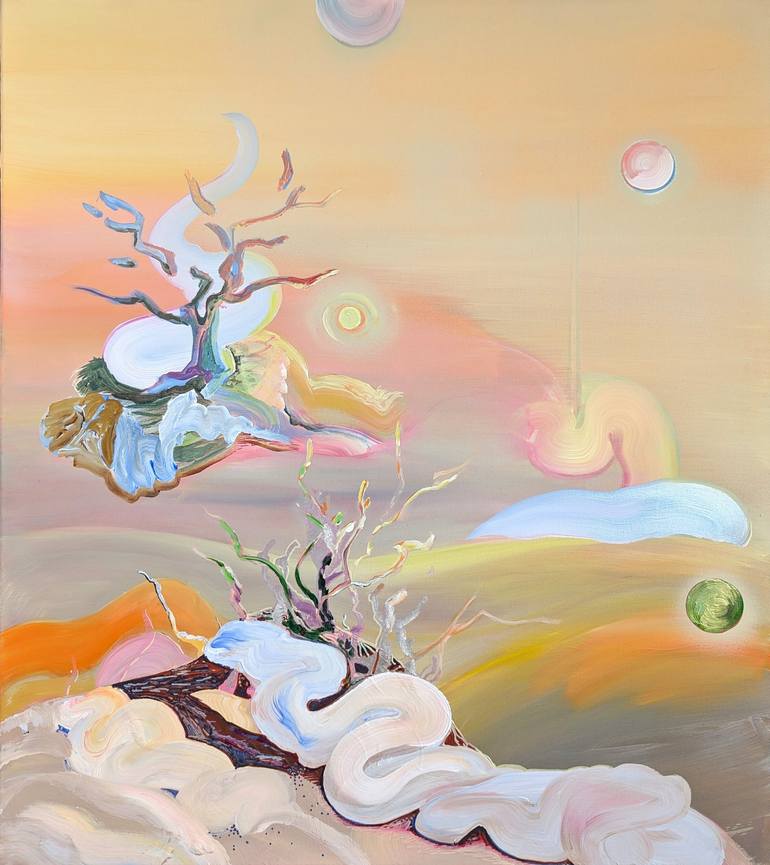 Cosmic Bloom was inspired by my fascination with resilience and growth in even the most challenging environments. This painting takes the viewer to a joyful desert landscape, far from Earth, where vibrant oranges, yellows, and beiges reflect the warmth of multiple suns, and a tree—though resting—pat...