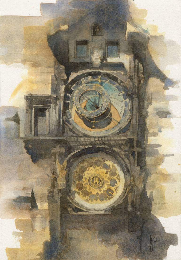 Painted from an image taken in Prague of the famed Orloj Astronomical Clock. First installed in 1410 this medieval curio is the 3rd oldest clock and the oldest running clock in the world. Here's an excerpt about this beauty from Wiki : "The Orloj is mounted on the southern wall of Old Town Hall ...