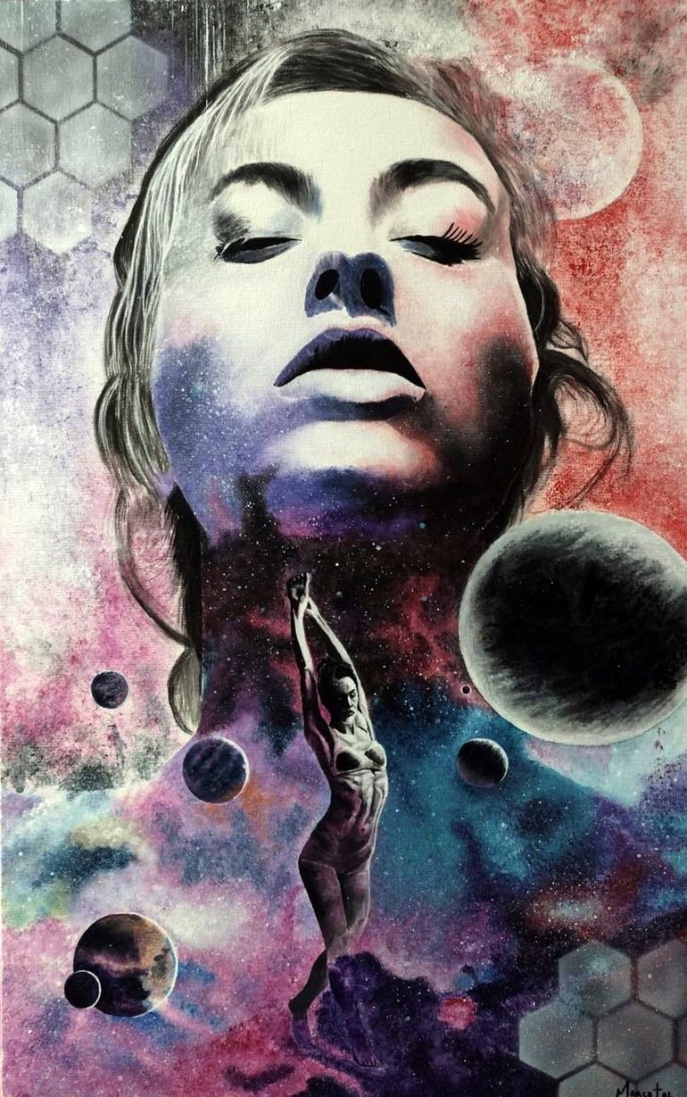 The artwork "Cosmic Dance" is a work that captures the beauty and complexity of the universe. The canvas is filled with textures, planets and vibrant colors, creating a sense of movement and dynamism. The face of a woman looking upward reflects the admiration and amazement at the grandeur of the cos...
