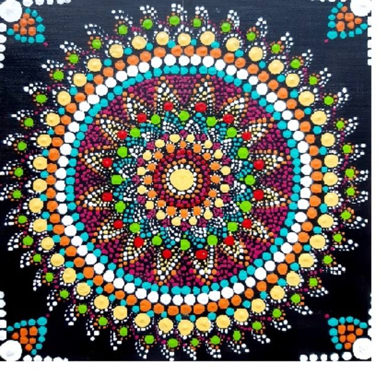 This mandala is from a series of 12 dot paintings. My inspiration for this design came from my love of vibrant, energetic and colourful bursts seen in Costa Rica, on my travels a few years ago. The texture of this painting is created using top brand acrylic paints onto canvas board, which can be ei...