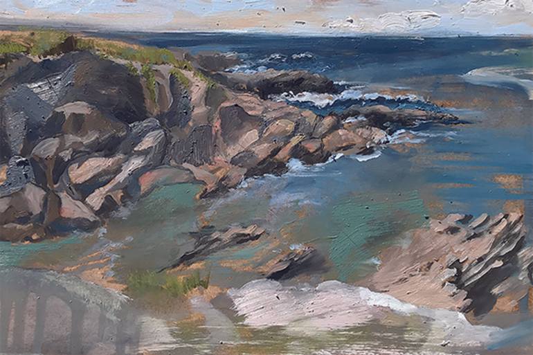 This oil painting was inspired by my two week trip camping in the back of my pickup truck while painting the wild coast of Brittany. This piece specifically was documenting Quiberon where the huge waves crash onto the rocks nonstop.